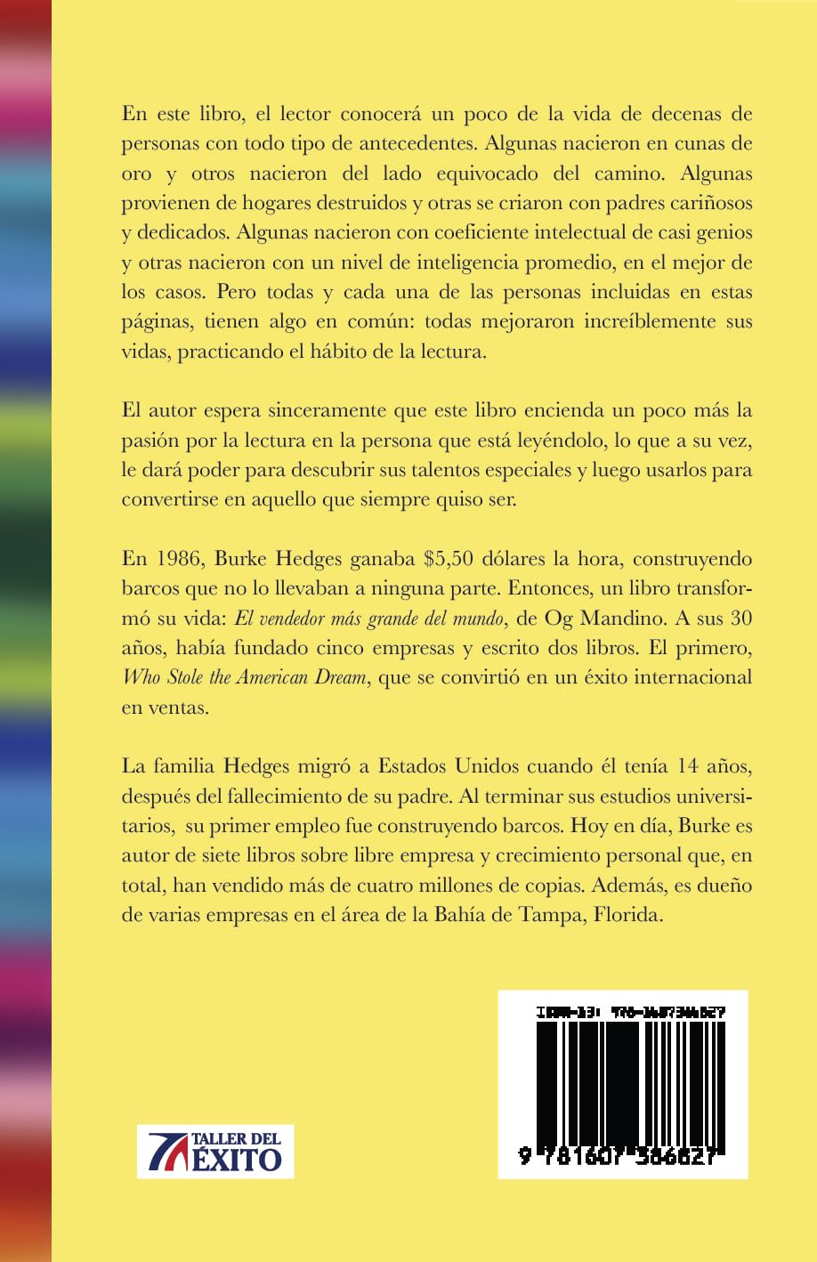 En este libro, el lector conocerá un poco de la vida de decenas de personas con todo tipo de antecedentes. Algunas nacieron en cunas de oro y otros nacieron del lado equivocado del camino. Algunas provienen de hogares destruidos y otras se criaron con padres cariñosos y dedicados. Algunas nacieron con coeficiente intelectual de casi genios y otras nacieron con un nivel de inteligencia promedio, en el mejor de los casos. Pero todas y cada una de las personas incluidas en estas páginas, tienen algo en común: todas mejoraron increíblemente sus vidas, practicando el hábito de la lectura. El autor espera sinceramente que este libro encienda un poco más la pasión por la lectura en la persona que está leyéndolo, lo que a su vez, le dará poder para descubrir sus talentos especiales y luego usarlos para convertirse en aquello que siempre quiso ser. En 1986, Burke Hedges ganaba $5,50 dólares la hora, construyendo barcos que no lo llevaban a ninguna parte. Entonces, un libro transformó su vida: El vendedor más grande del mundo, de Og Mandino. A sus 30 años, había fundado cinco empresas y escrito dos libros. El primero, Who Stole the American Dream, que se convirtió en un éxito internacional en ventas. La familia Hedges migró a Estados Unidos cuando él tenía 14 años, después del fallecimiento de su padre. Al terminar sus estudios universitarios, su primer empleo fue construyendo barcos. Hoy en día, Burke es autor de siete libros sobre libre empresa y crecimiento personal que, en total, han vendido más de cuatro millones de copias. Además, es dueño de varias empresas en el área de la Bahía de Tampa, Florida.